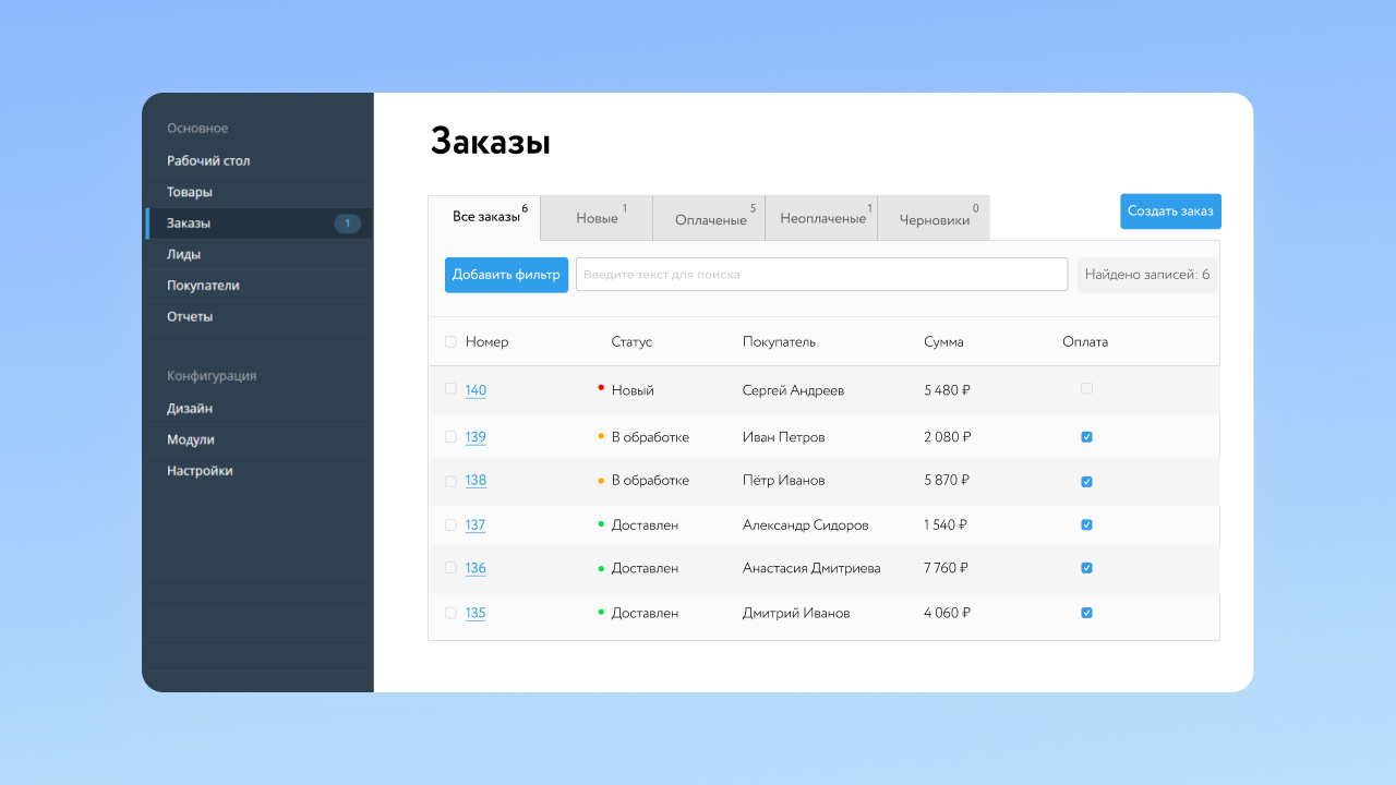 Полный функционал для запуска онлайн-бизнеса: корзина, оплата, доставка, CRM, аналитика