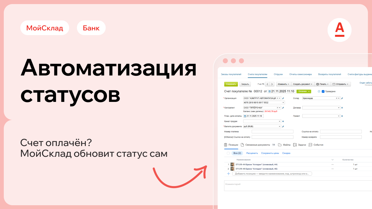 Интеграция автоматически загружает банковские платежи, привязывает их к счетам покупателей и обновляет статусы, создавая контрагентов и корректно отражая переводы между счетами.