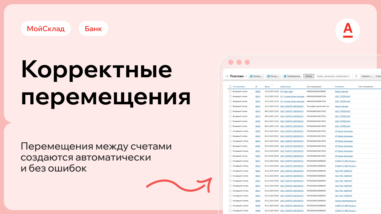 Что это дает вам: Интеграция сама корректно распознает и оформляет внутренние переводы, исключая лишние ручные корректировки, экономя время вашего бухгалтера.