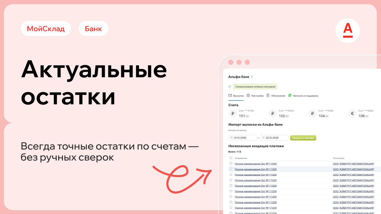 Что это дает вам: Больше не нужно запрашивать выписки у бухгалтера или заходить в онлайн-банк - точный остаток по каждому счету всегда на виду прямо в МоемСкладе