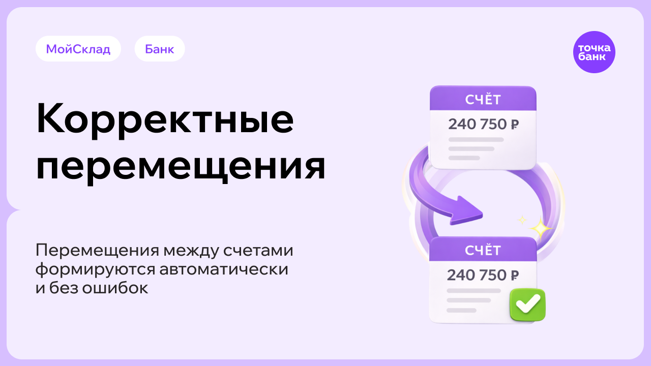 Что это дает вам: Интеграция сама корректно распознает и оформляет внутренние переводы, исключая лишние ручные корректировки, экономя время вашего бухгалтера.