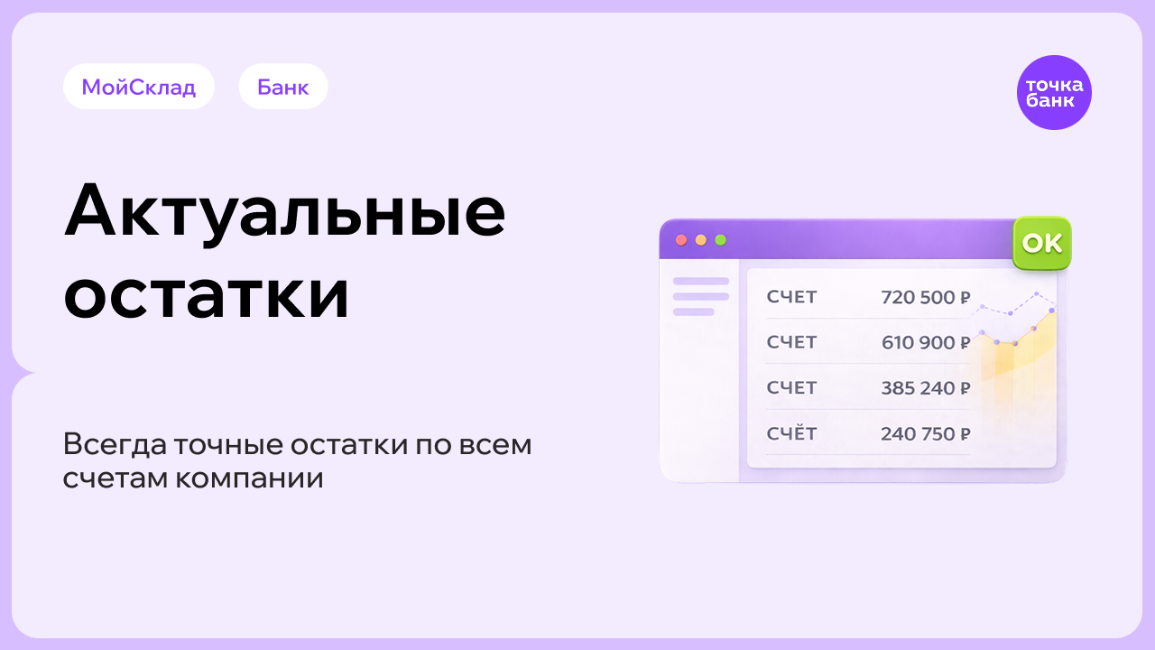 Что это дает вам: Больше не нужно запрашивать выписки у бухгалтера или заходить в онлайн-банк - точный остаток по каждому счету всегда на виду прямо в МоемСкладе