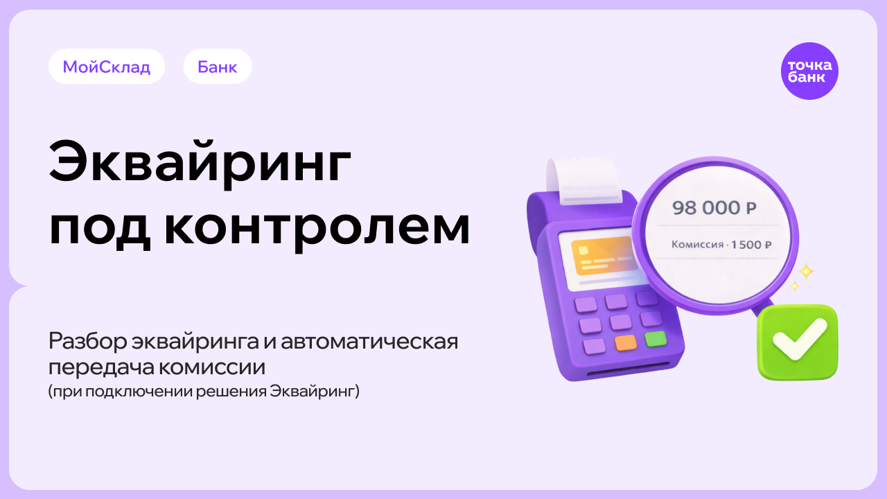 Если у вас подключен наш интернет-эквайринг Т-банка, приложение берет на себя весь его бухгалтерский учет. Оно само разбирает банковские платежи, корректно разделяя сумму от клиента и комиссию эквайринга, создавая все необходимые документы в МоемСкладе.
