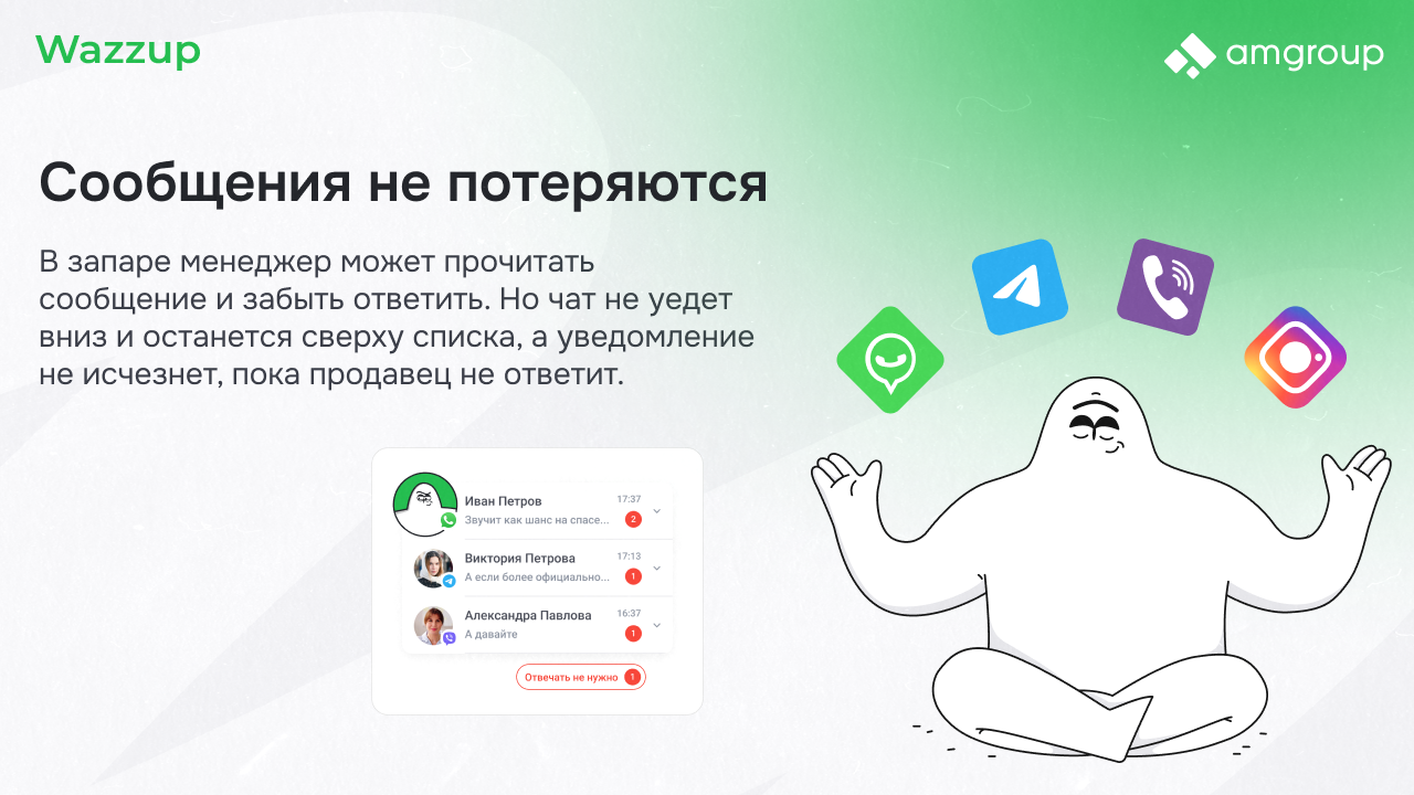 Решение работает с каналами: WhatsApp, WhatsApp Business, Instagram, Telegram, MAX, ВКонтакте, Авито, Viber.